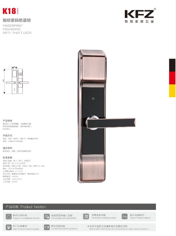 智能门锁的优点比较多,这些优点还是非常明显的,想了解更多相关知识,可以搜索我们的微信公众平台“德国KFZ智能五金”,也可以扫描网站下方二维码关注。锁,指纹锁,智能锁,五金,五金锁具,指纹锁厂家,智能锁批发,就找KFZ智能家居五金。